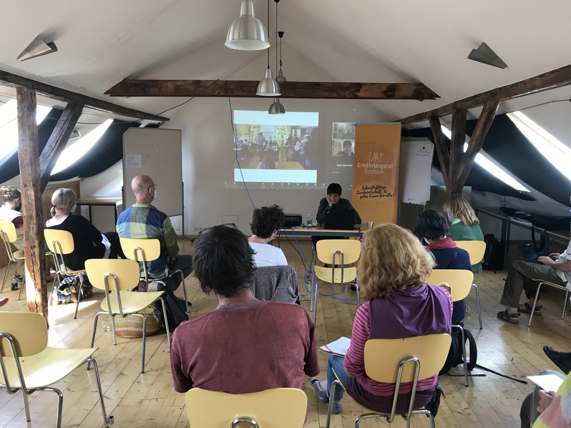 Ca. 20 interessierte Bochumer*innen tauschten sich über die Idee aus, Ernährungspolitik in und für Bochum zu machen, und wurden durch Erfahrungsberichte vom Kölner Ernährungsrat angeregt und ermutigt.